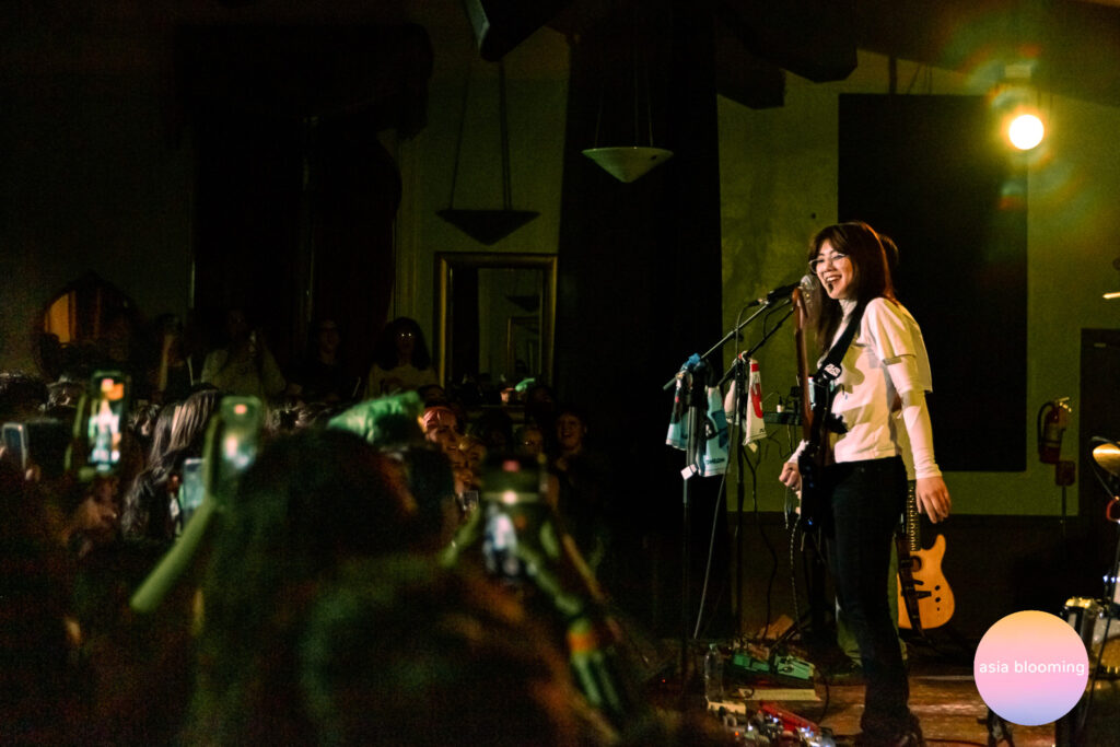 Almost exactly on the stated start time, the band stepped onstage and was greeted with excited cheers in the sold-out venue. They launched immediately into “joke!”, an uptempo, almost abrasive song with tongue-in-cheek lyrics. Hwang SoYoon, the main vocalist, guitarist, and de facto spokesperson of the group, is charismatic in an edgy way, sporting thin-rimmed glasses and a shock of maroon hair. Despite having a bit of hoarseness in her upper register and admitting to being tired from touring activities, she poured her heart out in the middle register and rocked out on the guitar. In fact, she seemed full of energy and would stride across the stage to interact with the other band members and with the audience. Compared to bands with more guitarists, the bassist, Park Hyunjin, plays a more prominent role and often has rhythmically and melodically interesting passages. Kim Hyungkyun, the drummer, joins the duo with a relaxed yet propulsive approach to the rhythmic backbone.