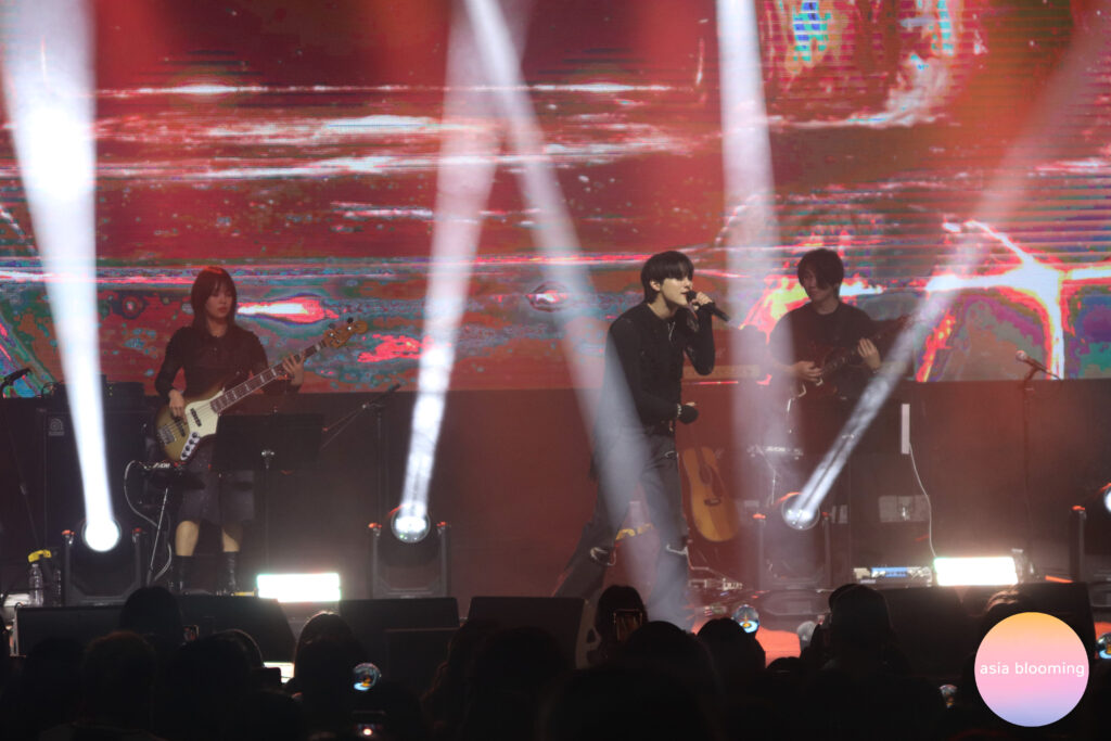 Arguably one of the most anticipated performances was reserved for near the end of the show: “Drowning.” Before diving into his rendition, WOODZ played an acoustic version of the song, inviting the crowd to sing the lyrics in his stead. Upon his request, the audience did not disappoint. Grasping the mic stand, the singer poured  his soul into performing the raw, sorrowful song about “drowning” in one’s tears after a lover leaves. In between lyrics, the singer still managed to find time to head bang to the band, fully feeling the instrumental harmony. At the bridge, he went down on one knee to passionately plead for the return of said lover. As WOODZ cried out the last line “You’re taking my life from me,” the spotlight above the singer turned off to bathe the stage in darkness.