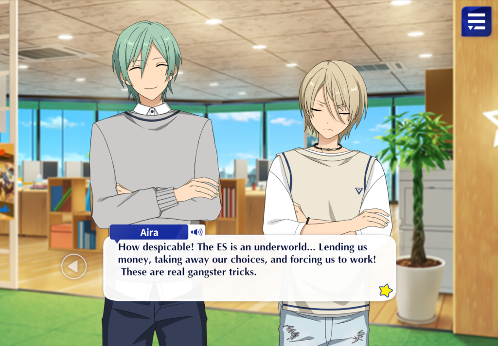 With so many idol gacha games out on the market, what makes Ensemble Stars!!! Music different? Interestingly, the storyline is slightly different than the norm. While players are considered a producer, they are not exactly a character in the game itself and the visual novel is very much from a third-person point of view. The story follows a group of unmotivated misfits at a music company called ES (Ensemble Square). ES has labeled these boys as underperformers and are essentially so bad that they are considered a waste of the company’s investments. However, the boys can’t just be fired as they have accumulated a lot of debt within the company using their resources without bringing in actual income as idols. The boys are given one last chance to become successful idols, so they must re-learn the basics on how and what it takes to become an idol.