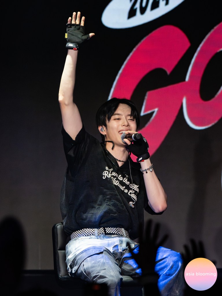 Getting back to the music, the group moved into “O.” The song’s slower R&B feel was a stark contrast from the songs performed thus far. The group showed off their excellent synchronization while performing the choreo, performing every dance move with a sharp precision developed from years of hard practice (as well as getting yelled at, according to Kangmin). As the song ended, Yeonho and Kangmin surprisingly left the stage. Yongseung and Gyehyeon introduced the next performance as “visuals on top of vocals” with the “endless charming duo returning.” Yeonho and Kangmin then returned to stage with mic stands as they performed “In My Blood” by Shawn Mendes. While the crowd was reeling from the duo’s performance, Yongseung and Gyehyeon took the stage to perform Jungkook’s “Standing Next to You.”
