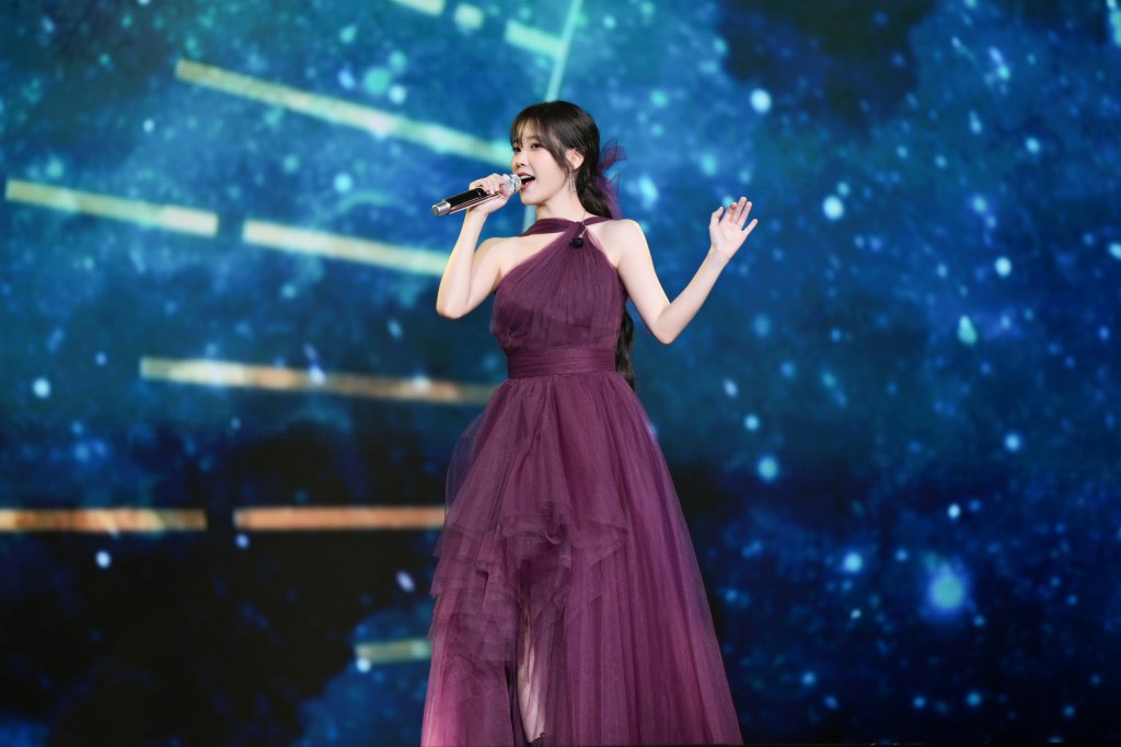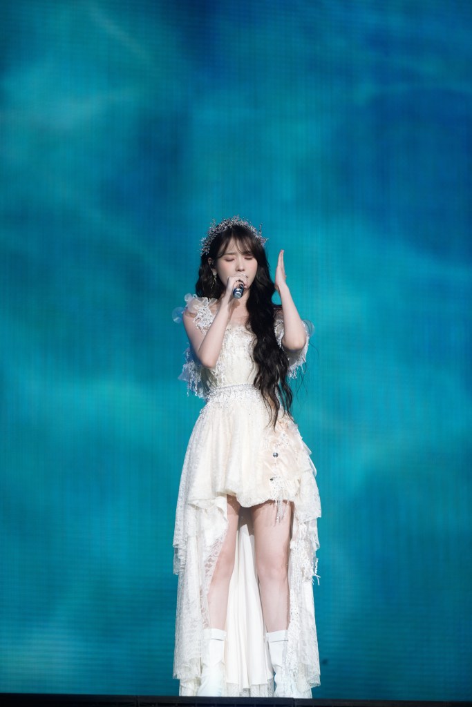 Getting ‘Romantic,’ IU made an outfit change into a dainty floral dress. Following a graceful performance of the upbeat Latin-jazz track, “Havana,” the singer slowed it down for some sentimental ballads. Collaborating with the audience in what essentially became a duet, IU performed “Meaning of You” with fans diligently singing each time she turned the mic to the crowd. “The next song is one of my personal favorites from my own songs. I’m so happy to share it with you,” the artist began. “I’m wishing you a peaceful night. I light fireflies by your window. The meaning of those fireflies is ‘I love you.’” With that, she sat atop the platform to sing “Through the Night,” as fireflies floated in the night sky on the screen. IU’s gentle and soothing vocals filled up the venue and compelled listeners to sway along to the lilting lullaby-like melody.