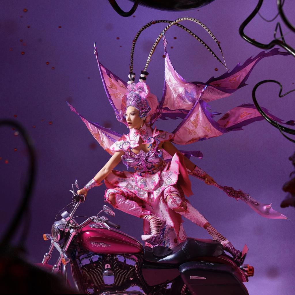 For her solo performance, Plastique Tiara appeared on stage in a yellow outfit which seems to take inspiration from the traditional Vietnamese attire, áo nhật bình. In the Nguyễn Dynasty, this outfit was only worn by women of high social status. The robe color indicates social positions, and pure yellow was worn by empresses and empress dowagers. Showcasing her long draping sleeves, Plastique elegantly performed to a Vietnamese song, “Nửa Vầng Trăng” (Half Moon) by Như Quỳnh. Switching it up, the dancers grabbed both of her sleeves to rip apart the robe and reveal Plastique in a black latex outfit based on Sailor Starlight from Sailor Moon, an anime that deeply influenced the performer growing up. The flashing stage lights made the outfit and music change all the more dramatic. To complete her new look, she loosened her bun to release a long black ponytail with glittering hair tinsel.