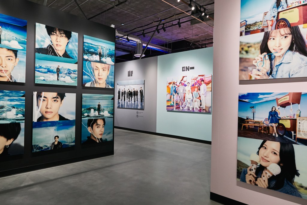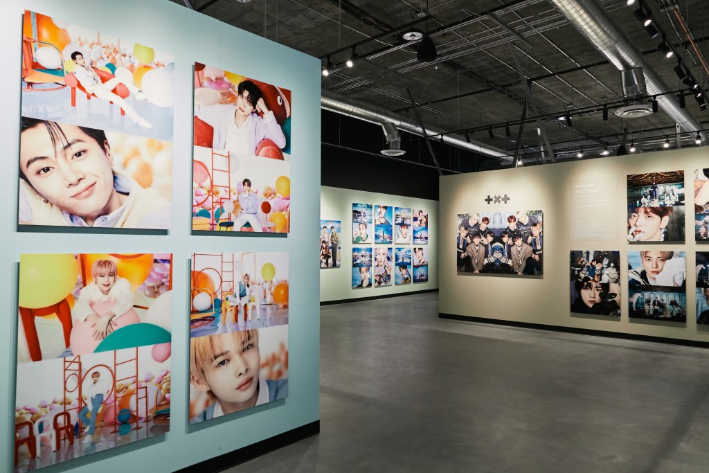 This leads into the ‘Concept Photo’ area, where each group was given a themed photoshoot. One group photo and individual photos of each member are on display, along with a description of each theme. SEVENTEEN represents ‘A boy’s paradise,’ NCT DREAM portrays ‘The dream garden,’ Stray Kids portrays a ‘Time Turner’ concept, TOMORROW X TOGETHER (TXT) visualizes a concept of ‘The New world,’ the only girl group, TWICE, portrays the ‘Blooming Station,’ BTS represents ‘The blue stone = The Glacier,’ ENHYPEN youthfully show off the ‘Imaginary Playground,’ NCT 127 displays ‘A room of dreams,’ and NU’EST poses with a ‘White Desert’ theme.