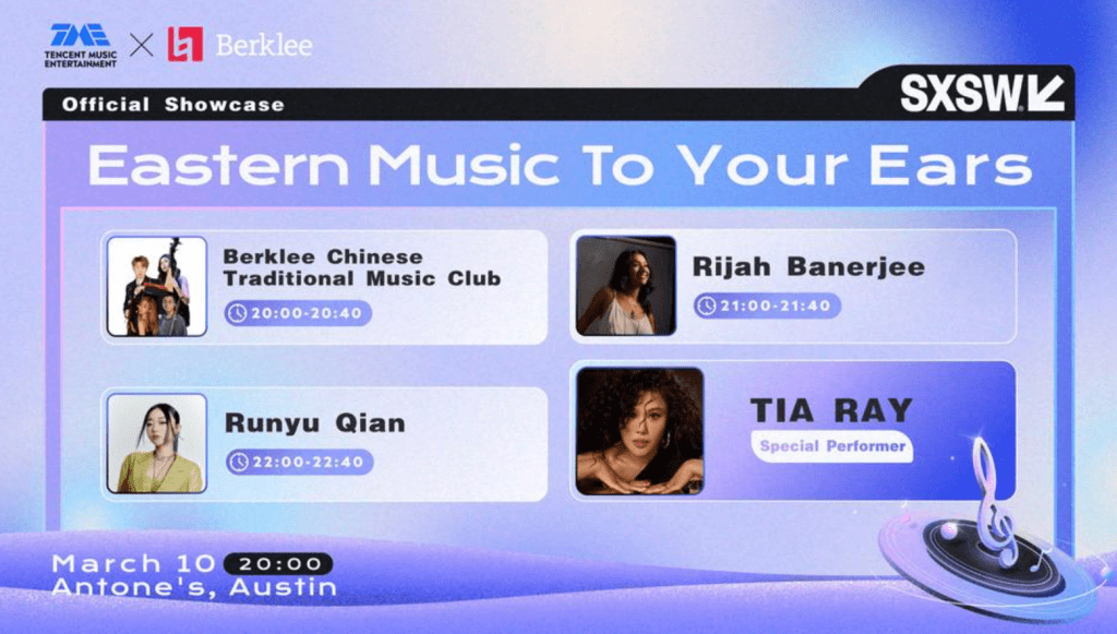 Tencent Music Entertainment and Berklee College of Music are collaborating on a musical showcase as part of 2025’s SXSW Music Festival. Combining the genre blending energy of Chinese traditional music and Western jazz, this event will feature four performances from Berklee Chinese Traditional Music Club, Rijah Banerjee, Run Yu Qian, and Tia Ray.