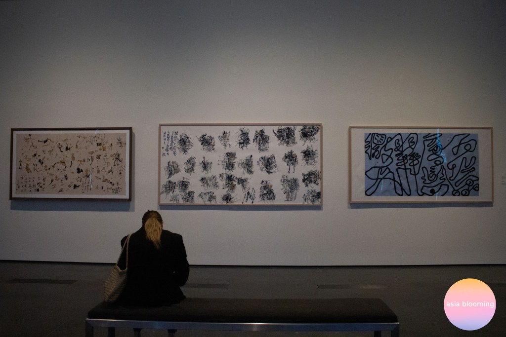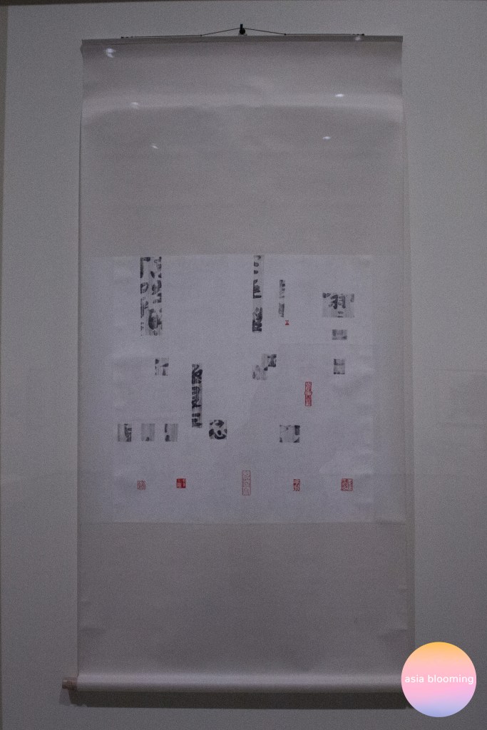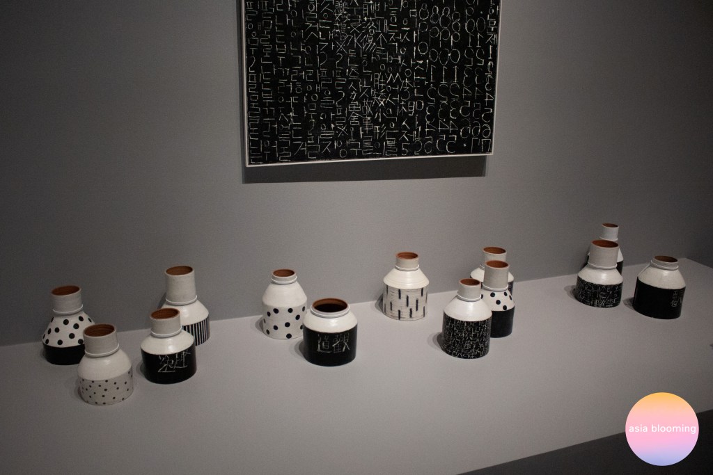 Also part of the same section is Lee In’s Black, Something 2 and Black, Something 3, which commands attention as soon as it comes into view. As one of the only pieces in the collection that is painted on a non-flat surface, the ceramic pots on display are the first thing that everyone’s eyes turn to, especially once the large black canvas comes into sight. “I made this piece by covering my canvas in black, and etching out the written characters,” the artist began, sharing the process of his work. “Then, I wrote in the words to the poem “Ogamdo” by Yi Sang.” Ogamdo features Chinese characters, Korean characters, and numbers, all in varying directions and font styles. He continued, “Yi Sang wrote this poem when he was in the hospital, as it was a visualization of what he had in his view and mind while he was sick.” Though he had assistance when it came to making the ceramic vases, the painted characters on them are all by the artist himself. “Some pieces also feature parts of Ogamdo, while others just contain other writings based on how I felt while I was painting them.” On why he chose Ogamdo to decorate his works, Lee In cited his desire to create something that bridges the past and the present: “This poem was written in the 1930s, during the dark time period in Korean history that was between the Joseon era and modern day. I wanted to create something contemporary that still showed the influence from that time period. A lot of our history and culture is from China, but nowadays, there are more differences. I wanted that to reflect [in this piece].”
