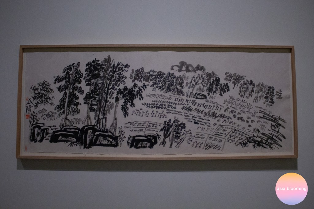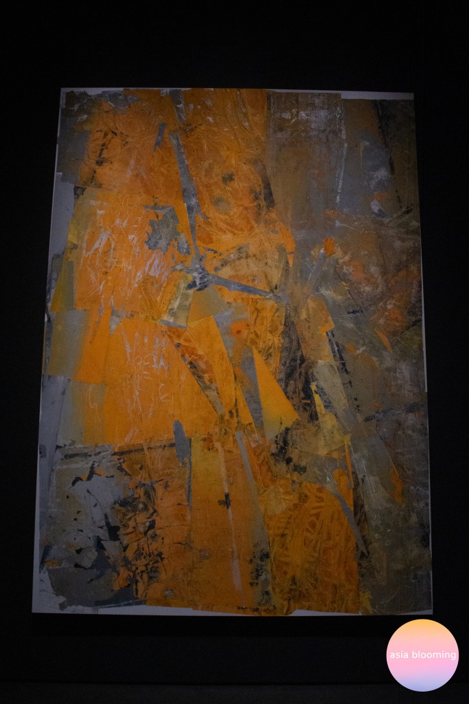 In Abstraction, much of the art focuses on textures, layers, and splashes of color, highlighting specific aspects to tell a story. Wei Ligang has several art pieces in this section, but Wei State of Myriad Beings, Untitled, and Stone Tower on Green Mountains are placed side by side to tell a connected story. While each work depicts different scenery and concepts, what they share in common are the materials used. All three are created with ink and paper, but Wei State of Myriad Beings and Untitled also had bits of gold foil. The artist shared there isn’t much meaning behind each small detail, and his decision to use the gold foil reflected that arbitrariness: “[In 2012 when I] made the Untitled piece, I had so much of the gold foil left. Most artists would just toss it away, but I kept it, and I ended up making a piece around the use of the rest of it. [That piece was] Wei State of Myriad Beings.”