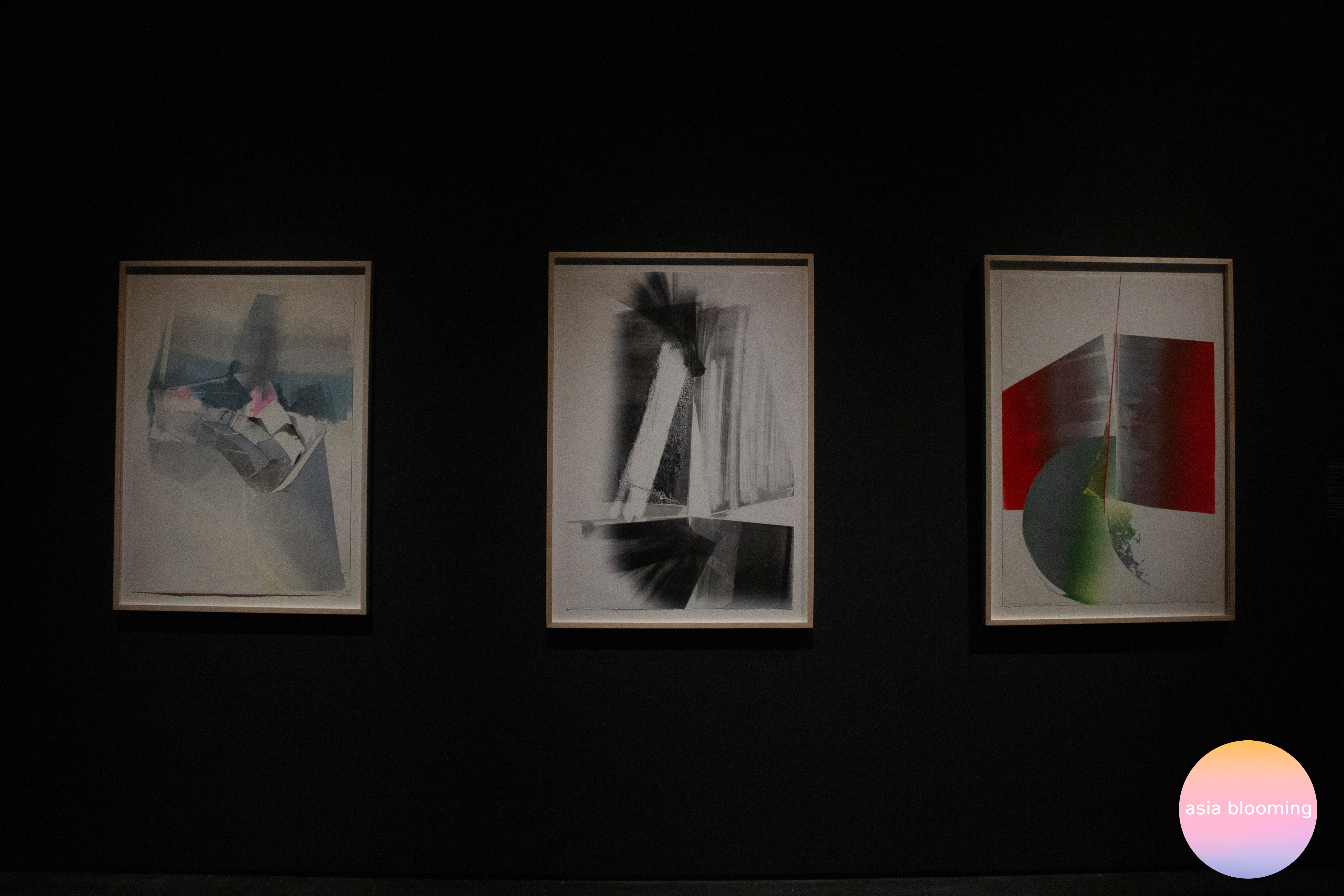 Although this is not Zheng Chongbin’s first solo show in the U.S., this is his largest one to-date. The collection emphasizes his work with light and space, and acrylic and ink. When first walking into the gallery, attendees are immediately immersed in a dark setting with dim lighting. With spotlights on each artwork and the peaceful ambient sounds, it’s as if you’ve walked into a separate, private world away from the busyness of everyday life. The pieces are primarily in grayscale tones as you walk the path of his exhibit, until you reach the highlighted Golden State canvases. Golden State is a close-up study of Californian light, and an abstract view of the state’s shape. The piece features harsh and sharp lines, with broken pieces overlapping one another, which was said to take inspiration from California’s fault lines, rock strata, and forest fires. This piece was created specifically for the gallery, and is equally impressive in size and in detail.