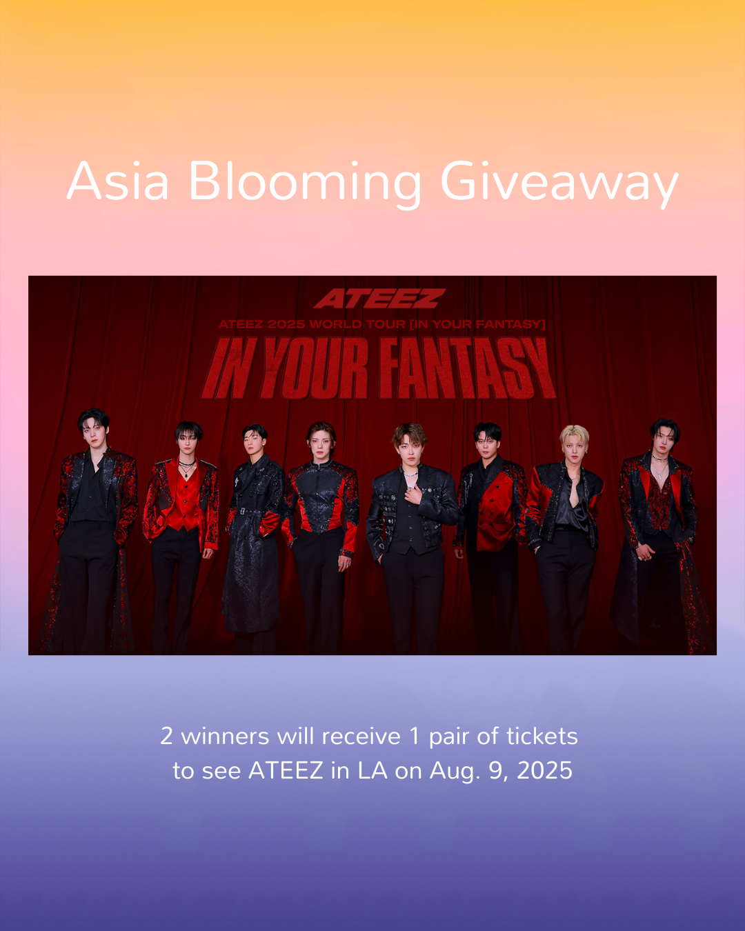 To celebrate ATEEZ’s tour, Asia Blooming is hosting a giveaway on Twitter and Instagram for two lucky winners to receive one (1) pair of general tickets to the group’s LA show on August 9, 2025! Entrants can enter the giveaway on either Twitter or Instagram. Enter on both Twitter and Instagram to increase your chances of winning!