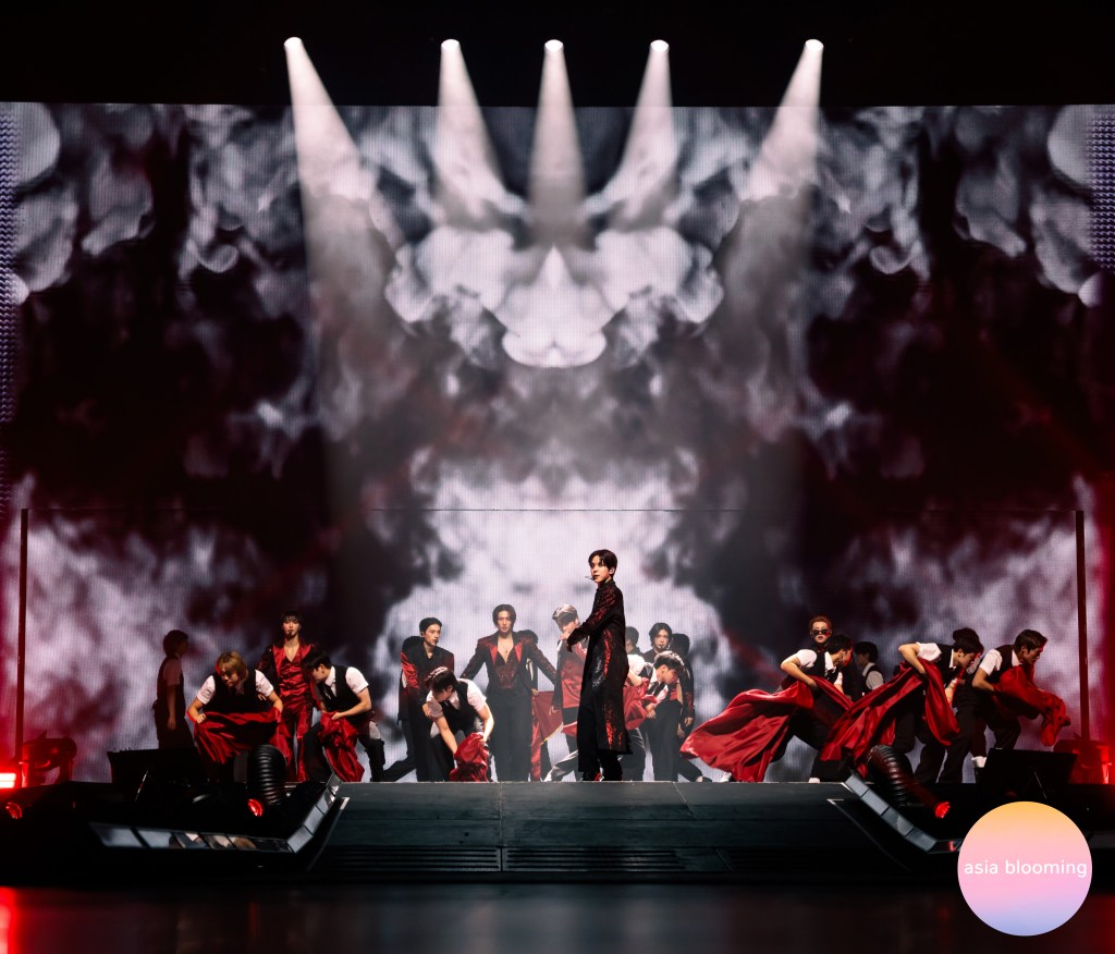 During their solo performances, each member showcased their own individual styles like Yunho’s sharp yet slick “Slide to Me,” Yeosang’s graceful and powerful “Legacy,” Wooyoung’s smooth and silky “Sagittarius,” Jongho’s emotionally charged “To Be Your Light,” San’s sultry “Creep,” Hongjoong’s ready-for-the-club “No 1,” and Mingi’s swagger-filled “Autobahn/Roar.” Of note, Seonghwa’s sensual performance of “Skin,” while clad in a snakeskin print jacket, led to a picture perfect moment that encapsulated the intense and alluring tone and meaning of the song. As Seonghwa stepped forward, the background dancers slowly peeled the jacket off from his outstretched arms behind him. The tension of the moment and the fabric clinging to his skin made Seonghwa’s drop to the floor and dramatic return to singing and dancing all the more impactful.