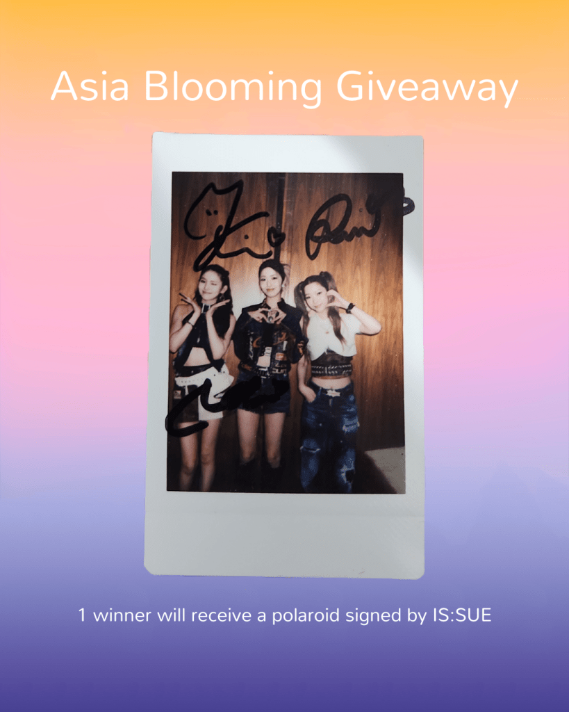 To commemorate IS:SUE’s first U.S. performance, Asia Blooming is hosting a giveaway on Twitter and Instagram for one lucky winner to receive a signed polaroid from the group! Entrants can enter the giveaway on either Twitter of Instagram. Enter on both Twitter and Instagram to increase your chances of winning!