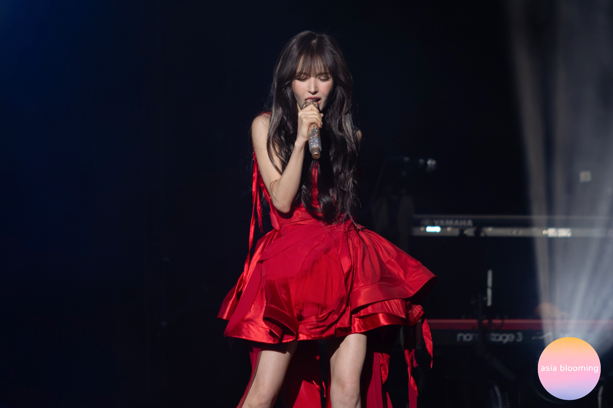 Dressed in a sleek red dress, Wendy sang these three sweet songs with a bright smile. “Chapter You” easily was one of the best performances of the night, just six songs into the show. The vocalist hit each high note in the chorus without breaking a sweat, extending the word “you” with masterful grace. Complementing the heartfelt lyrics and delivery, the stage lights also turned a soft orange-yellow, matching the warm tone of the track. After the performance, the singer also revealed the song to be one of her favorites to perform, something that clearly shone through with her execution. “The lyrics of this song compare a journey you share with someone special to chapters of a story. I feel like I’m writing a new chapter with fans every time I sing it. It’s a beautiful and unforgettable chapter in my life [that we are writing], and it means a lot to me.”