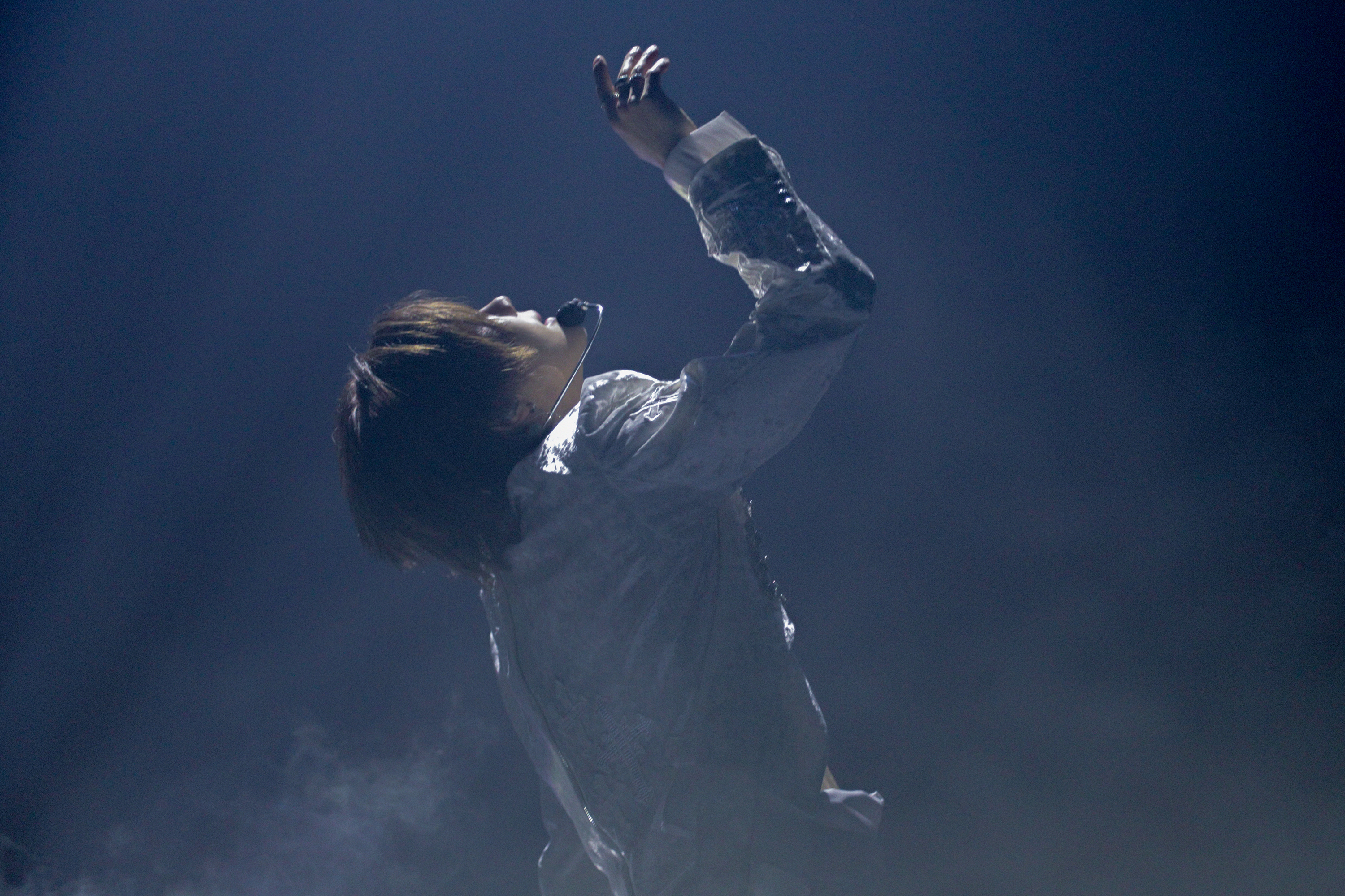 For this show, the singer told a story through his stage performances linked by videos. The night began with a grand unveiling. As ominous instrumental music played, dark red curtains parted to reveal Taemin, hanging in the air. The moment was reminiscent of the entrance of a demon lord or vampire. Slowly lowering down onto the stage, the singer was then enveloped by a heavy layer of fog. Donning a flowy white prince-like suit, Taemin was surrounded by his all-woman dance crew, who were dressed in bold black and gold warrior-esque outfits. Like a prince and his royal guards, their joint performance began straight away.